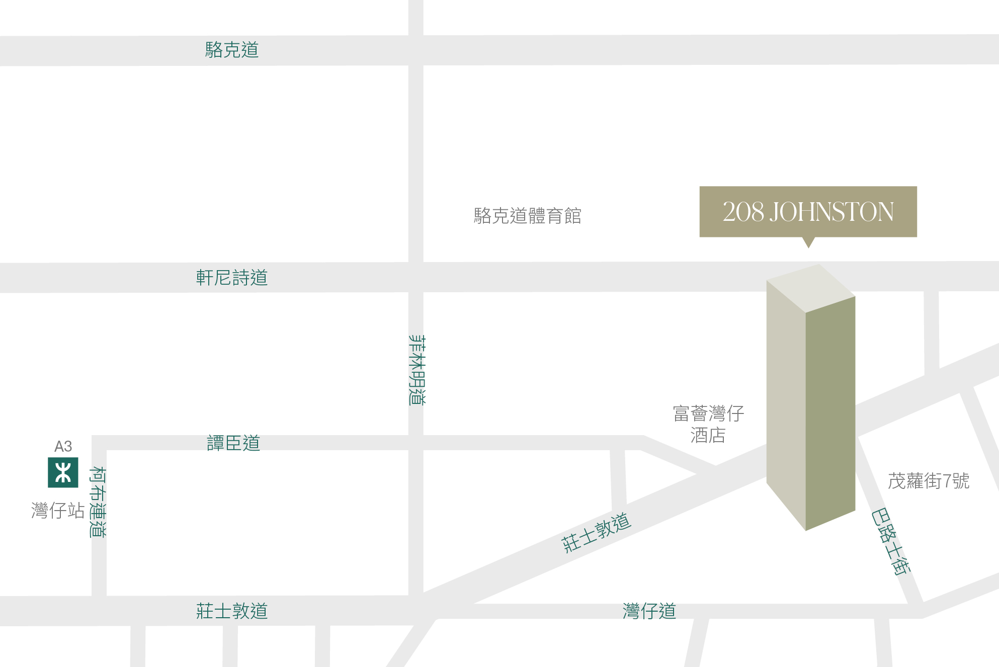 「208 JOHNSTON」傲拥港岛商业区核心地段,步行至港铁湾仔站只需约5分钟,紧密连系金钟及中环核心商业区。