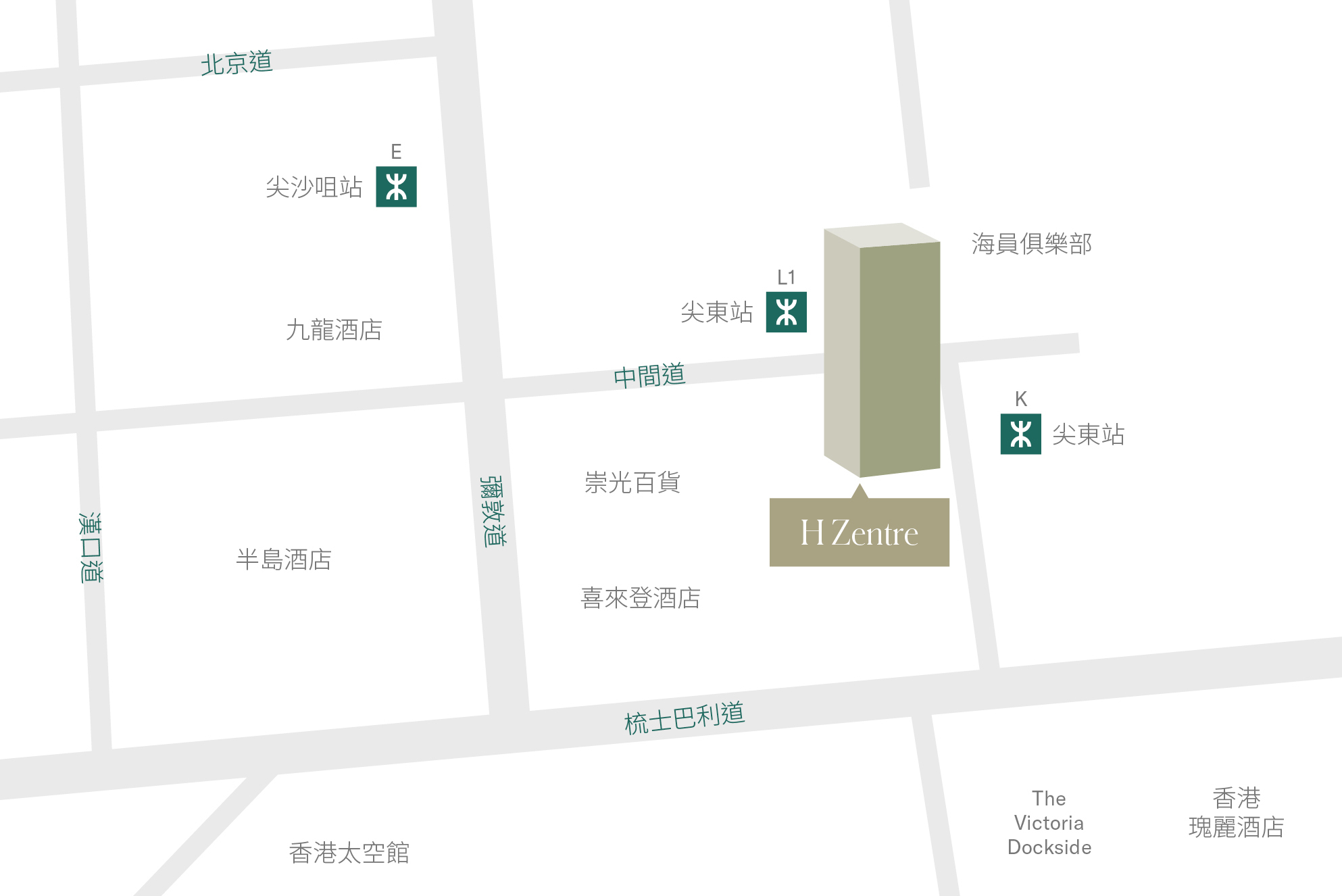 H Zentre顶楼的高级餐厅可饱览270度维港的绝佳景观。毗邻各游客热点和文化地标,H Zentre距尖沙咀、尖东地铁站和天星码头咫尺之遥,与西九龙广深港高速铁路仅一站之隔。随着区内的未来发展,位处优越及交通便利的H Zentre将成为健康生活的新地标。