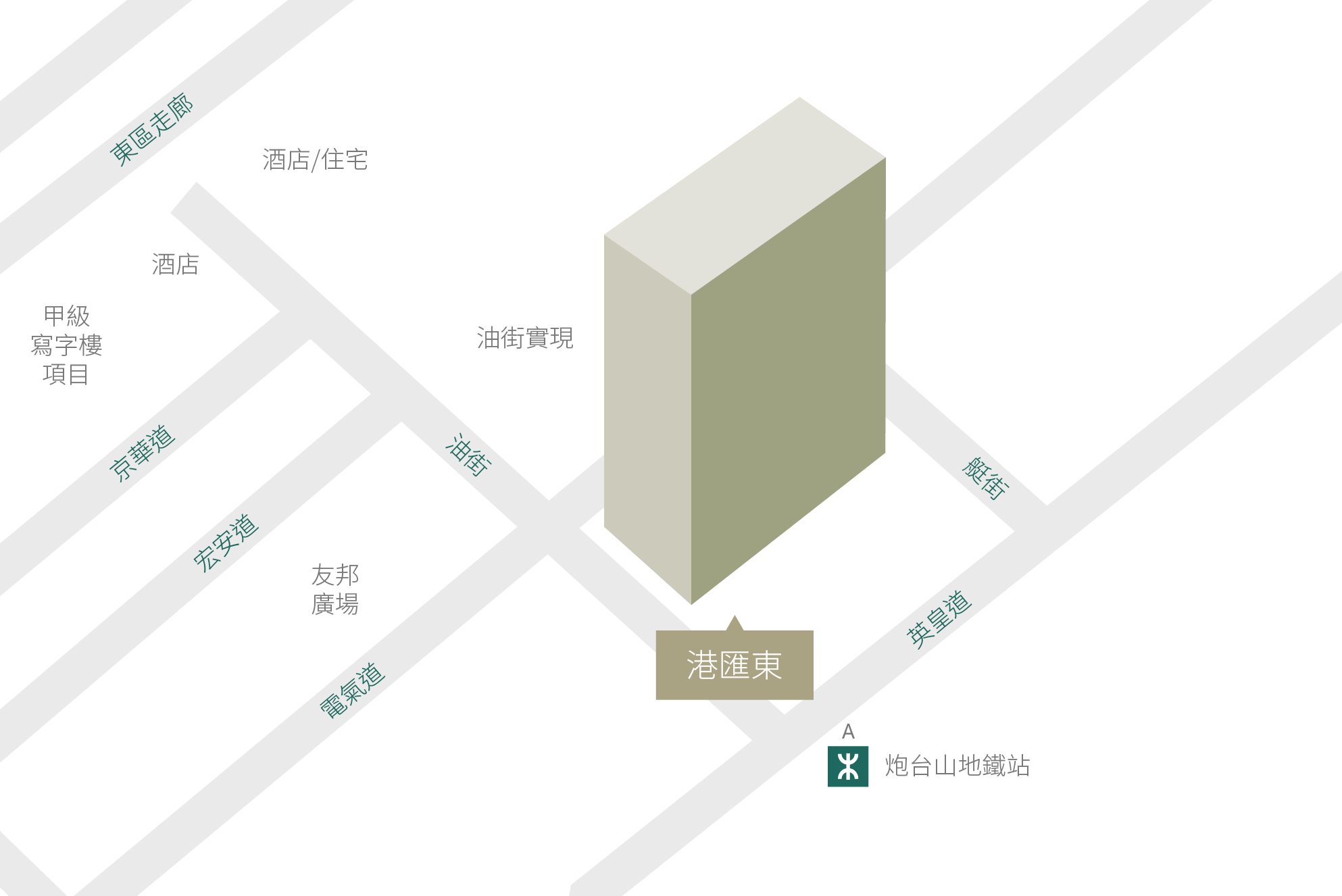 大厦位处港岛东商业区之门户地段,毗邻顶级商厦——友邦广场,并与港铁炮台山站近在咫尺,驾车更能快速连接中环及湾仔绕道与东区走廊,贯通四方。