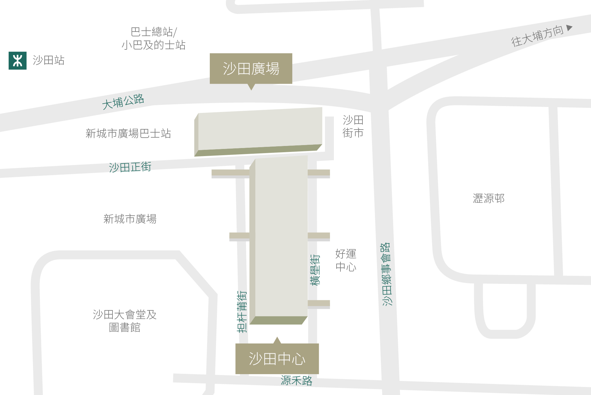 沙田中心及沙田广场位处沙田心脏地段,是区内80万居民的日常必经之地。两座商场以行人天桥相连,并同时连接沙田港铁站、巴士总站、沥源邨及禾輋邨,地理位置格外优越。