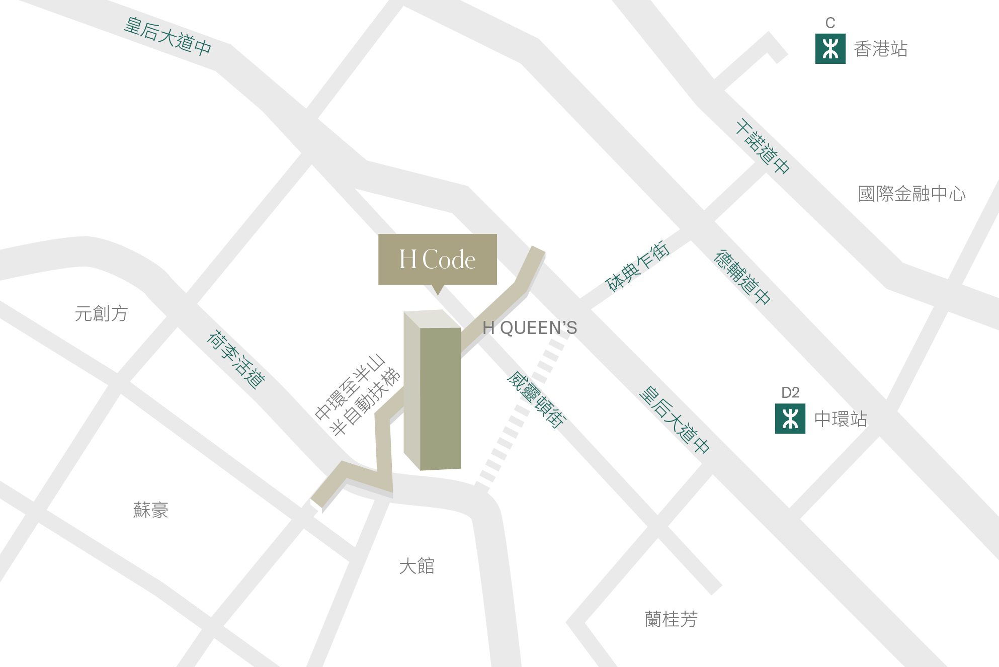 H Code 位於砵典乍街最高處,一座具時尚及生活品味的全新建築項目,俯瞰前中環警署大館,是中環最獨特及具時尚的新焦點。H Code 亦是一個創意與藝術發展的樞紐,聯繫中環獨有的時尚色彩;是一棟集創意、工作和娛樂等多元化活動於一身的地標。
